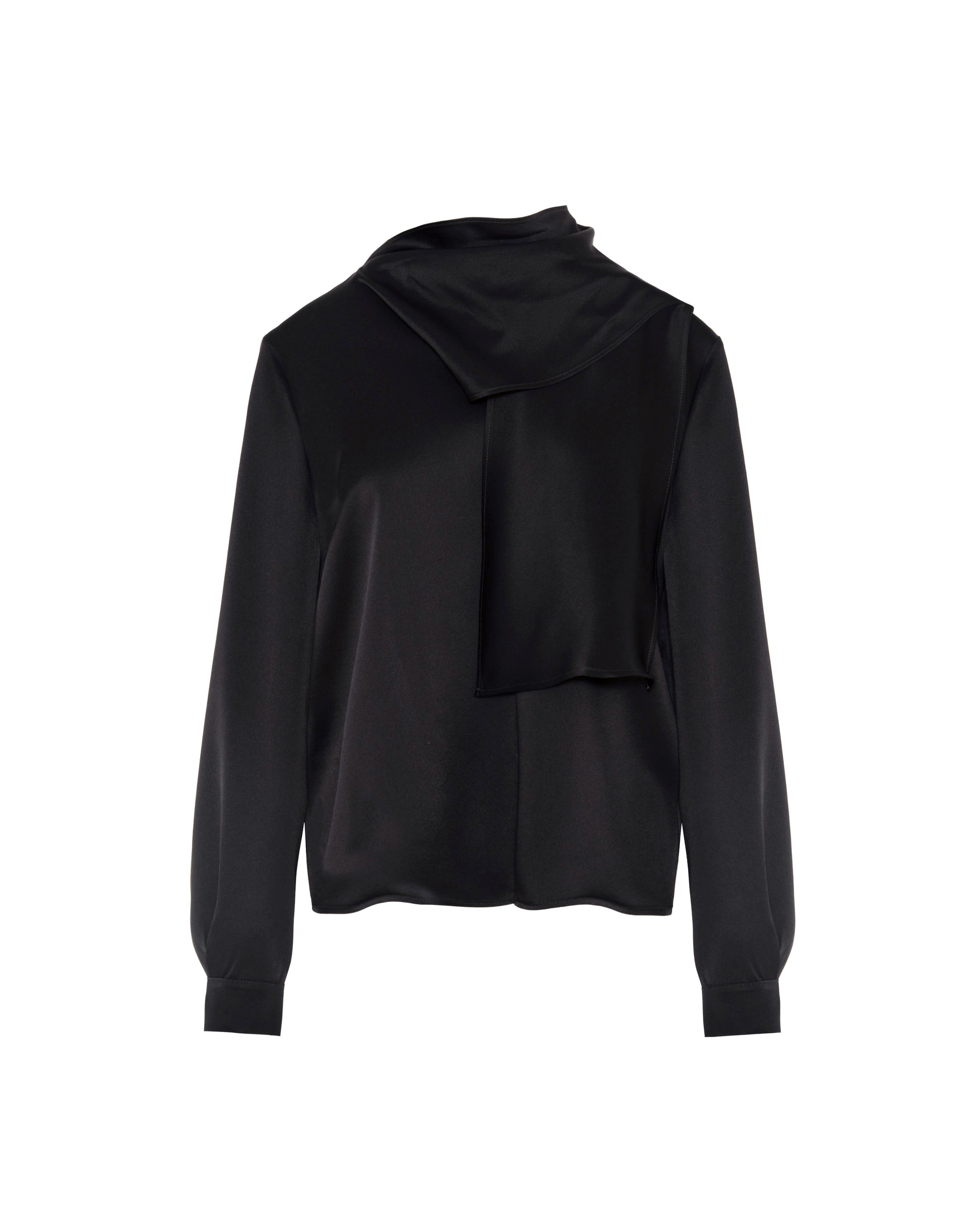 Femminile e moderna, questa blusa in envers satin si distingue per il suo design. Presenta un collo alto drappeggiato con chiusura laterale e laccio a foulard, maniche lunghe con polsini e una silhouette morbida e voluminosa. Perfetta da abbinare a un pantalone della collezione per completare il look. Prodotto in Italia.