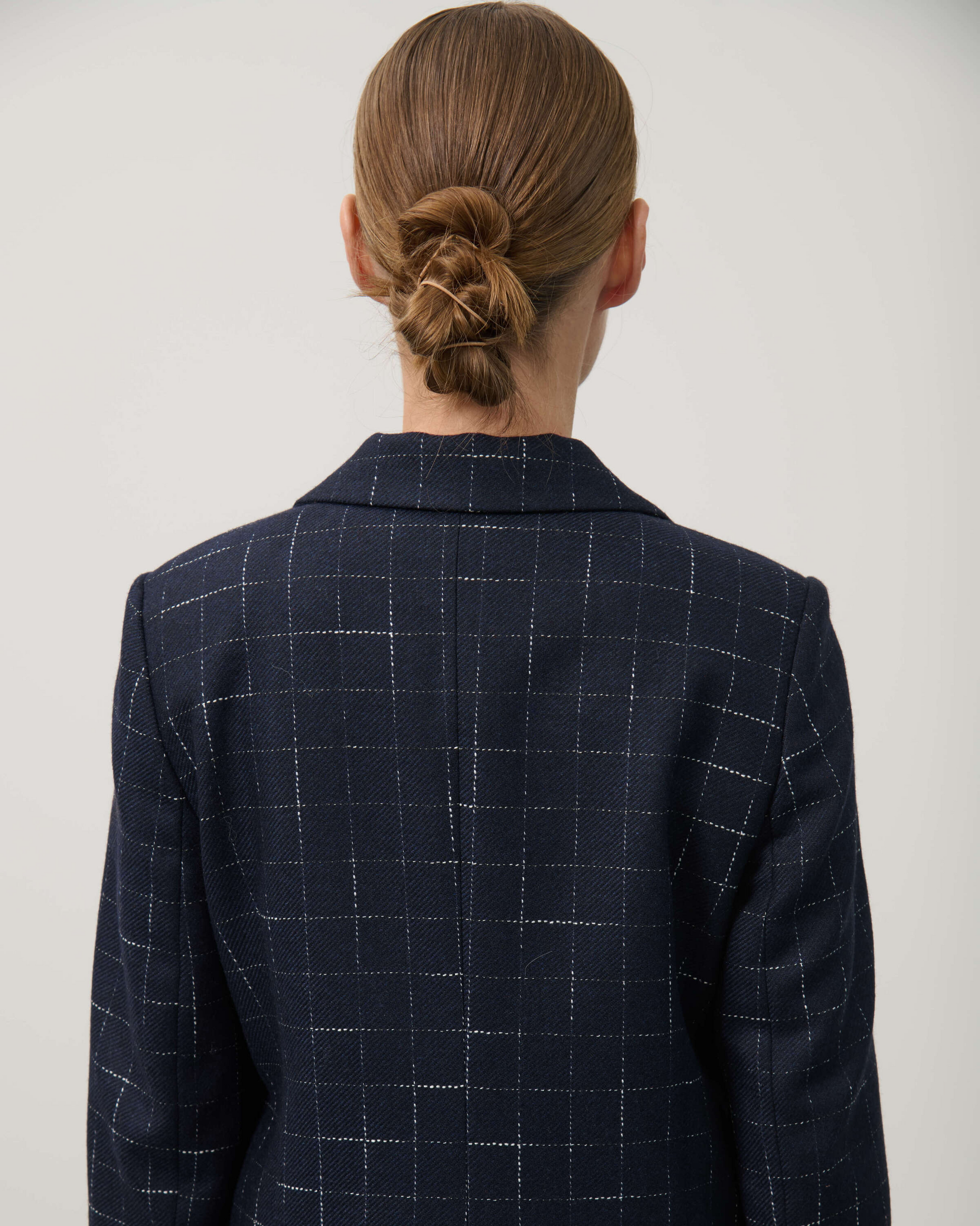 Creata su un taglio sartoriale maschile, questa giacca è realizzata con un disegno finestrato in misto lana. Presenta collo e rever tradizionali con apertura frontale con due bottoni a vista, tasche a uomo con filetto, maniche lunghe. Perfetta in combo con i suoi pantaloni coordinati per elevare il look. Made in Italy.