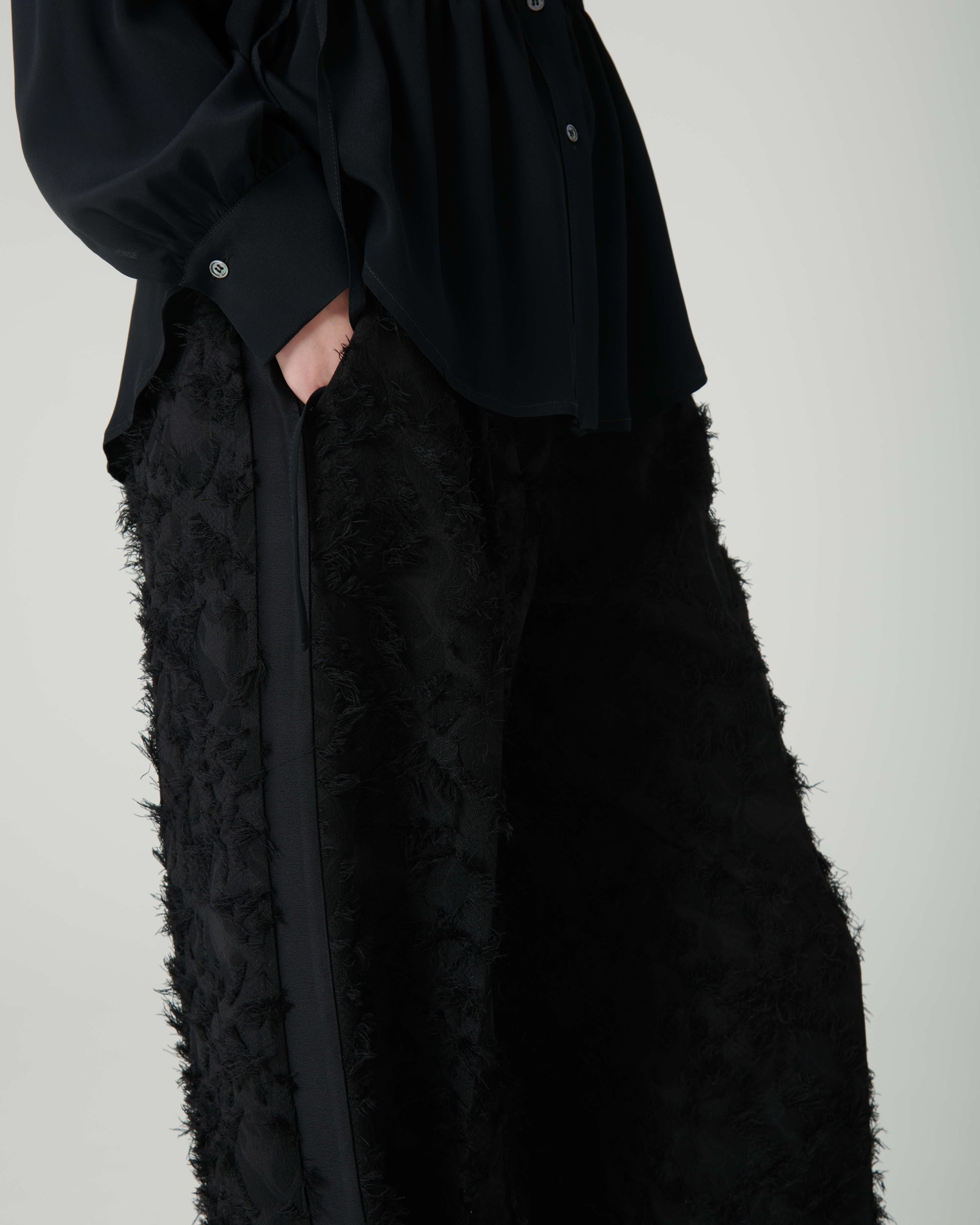 Pantaloni fil coupé con banda laterale beatrice .b Realizzati in tessuto fil coupé tono su tono, questi pantaloni fondono tradizione e stile contemporaneo. Presentano una vestibilità ampia, vita regolare con cintura ed elastico nascosto sul retro e pinces. La banda laterale in raso tono su tono aggiunge un tocco raffinato, mentre le tasche sono inserite discretamente ai lati. Prodotto in Italia.