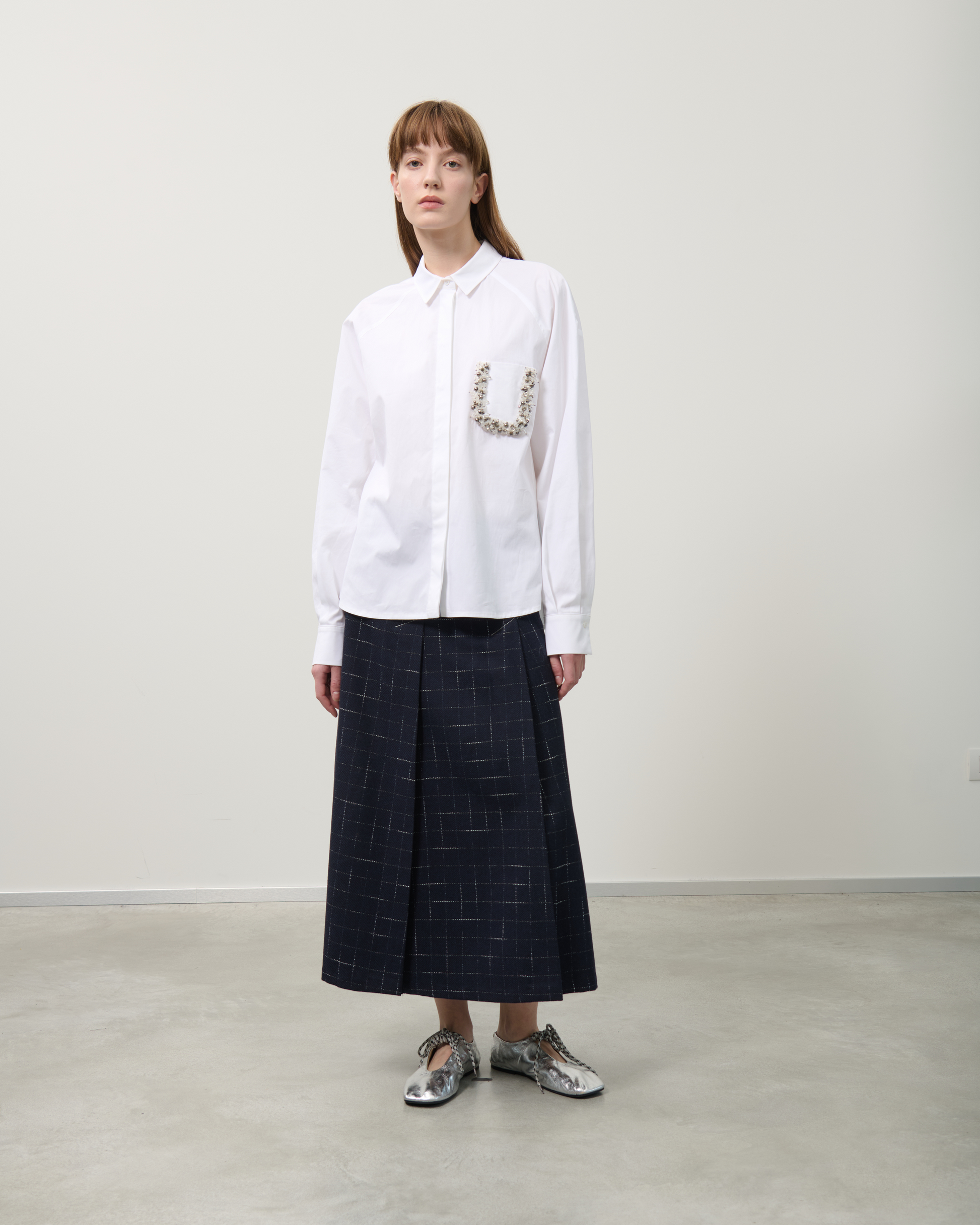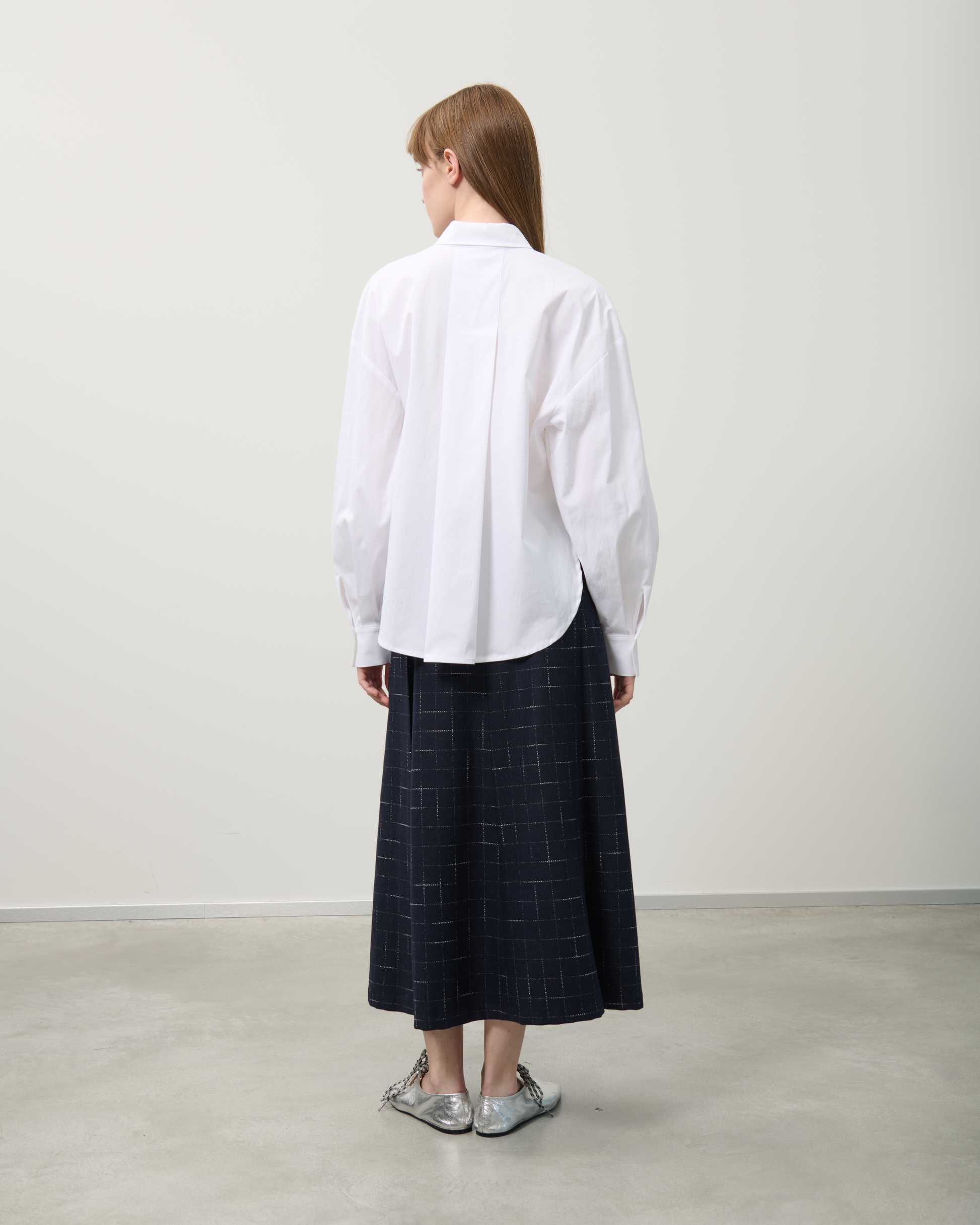 Il classico motivo a finestra è reso moderno da questa gonna a pieghe. Realizzata in misto lana, presenta una vita regolare senza cintura, una cerniera invisibile sul retro e pieghe con spacchi sia sul davanti che sul retro. Prodotto in Italia.